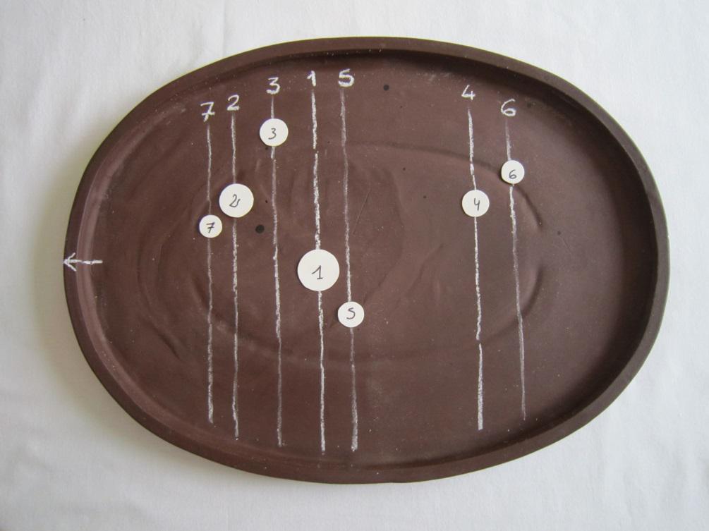 L’implantation en profondeur étant trouvée il reste à coller sur le pot les fils d’attache des arbres en lieu et place des pastilles.