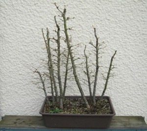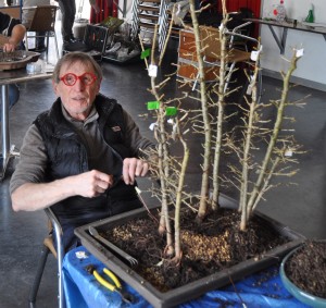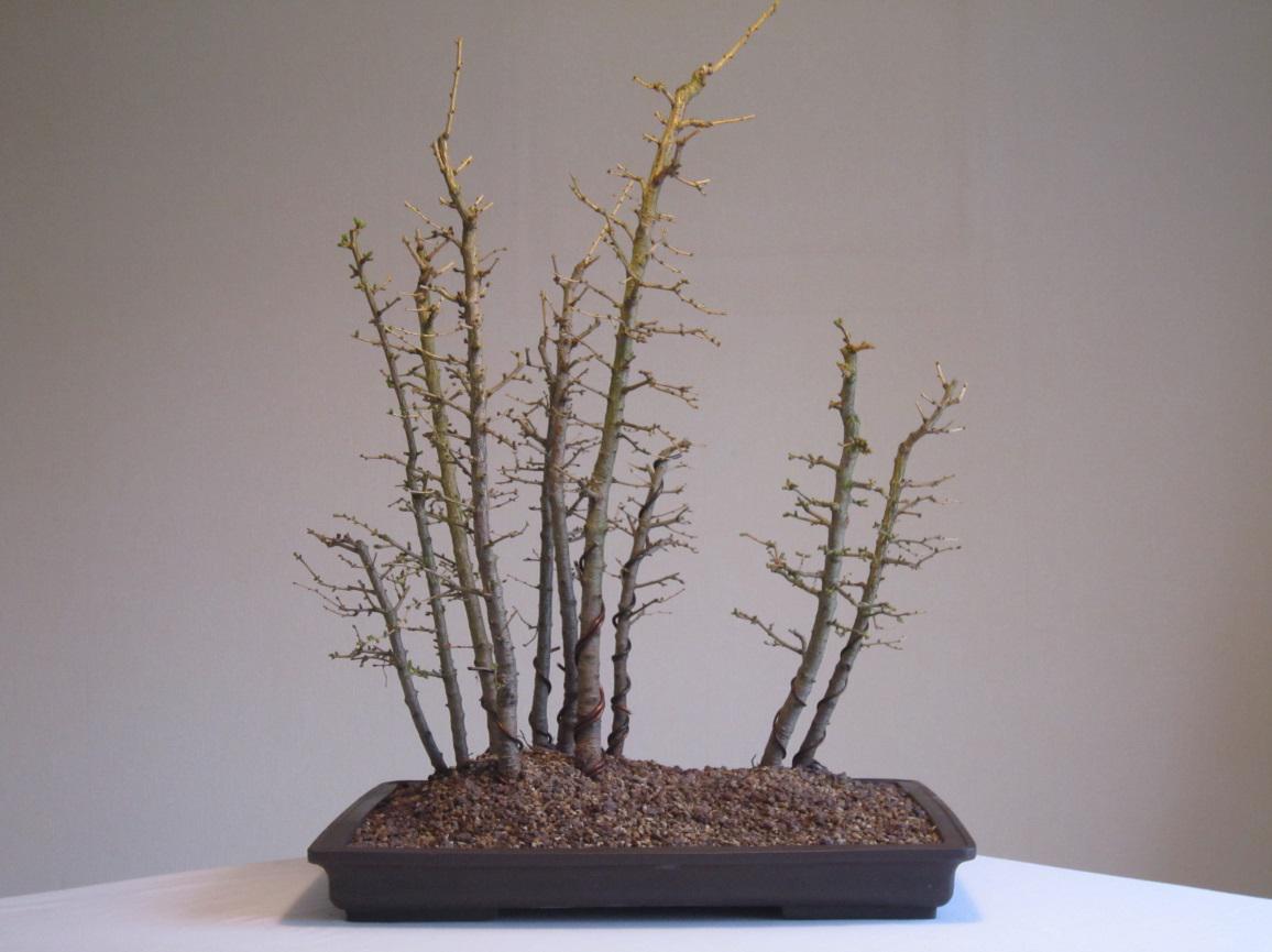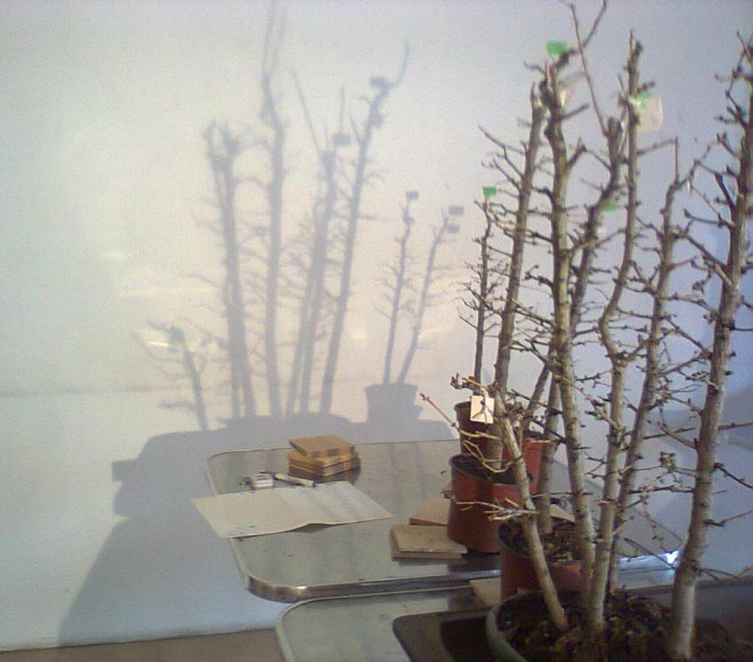 On positionne en premier l’arbre ou les arbres principaux suivis des autres, un par un, par tailles décroissantes, sans se préoccuper de leur position sur la table, (la taille des pots ne permettant pas de les placer en position souhaitée) en ne regardant que les ombres chinoises.