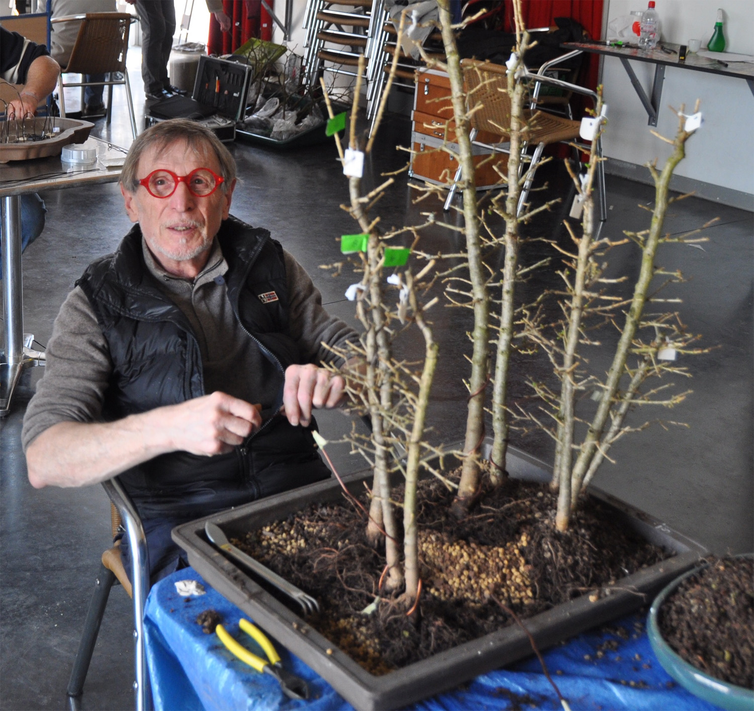 Au fur et à mesure, il faut peaufiner les implantations, tailler les branches inutiles, régler la verticalité des arbres ou les inclinaisons, vérifier la face de chacun d’eux en fonction de leur forme puis mettre le substrat jusqu’au bord du pot, évacuer les poches d’air avec une baguette et bien arroser l’ensemble.