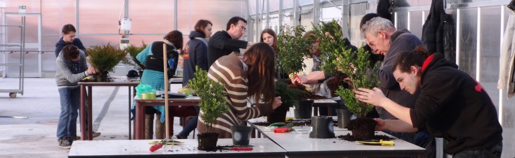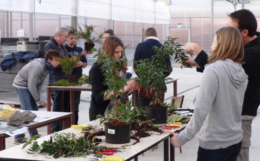 A partir de plantes de pépinière (genévrier, houx japonais ou même quelques cotonéasters mis en culture par les promotions précédentes), chacun a commencé à tailler et à former son propre sujet avant une prochaine étape qui sera celle du rempotage.